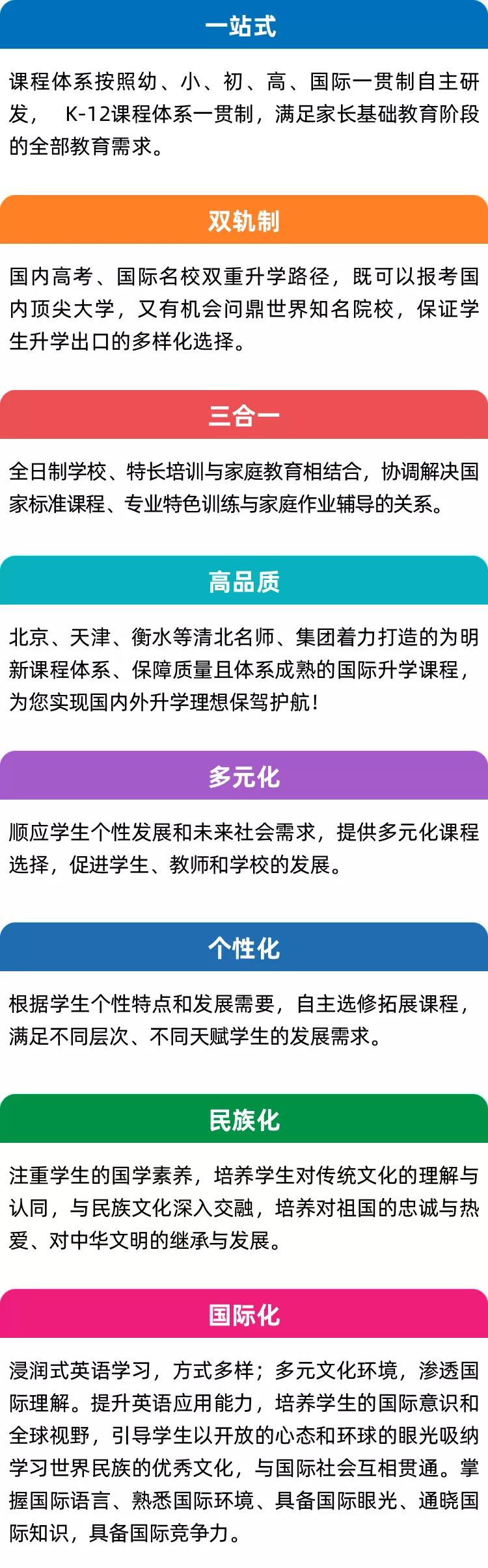 为明新课程体系的理念是:以中国传统文化浸润奠定学生坚实的国学素养,用领先同类级学校的英语水平开拓国际视野,培养国家强基计划基础学科特长学生,以艺育美、以体健体、以科促智,艺术、体育和科技竞赛成绩突出,促进学生全面发展基础上的个性发展和协调发展!